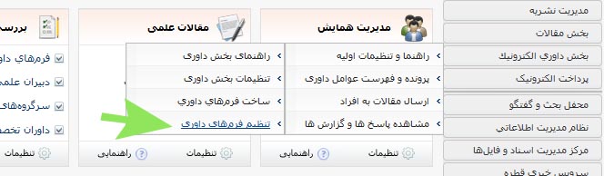 در این بخش امکان تنظیم انواع فرم داوری وجود دارد: فرم دبیر علمی، فرم داوری یا فرم معرفی داور توسط نگارنده. همچنین، می‌توان با توجه به نوع مطالعه (پژوهشی، کاربردی، گزارش مورد یا هر نوع مطالعه‌ی دیگری که در برنامه تعریف شود) فرم‌های داوری متفاوتی برای برنامه تنظیم کرد.