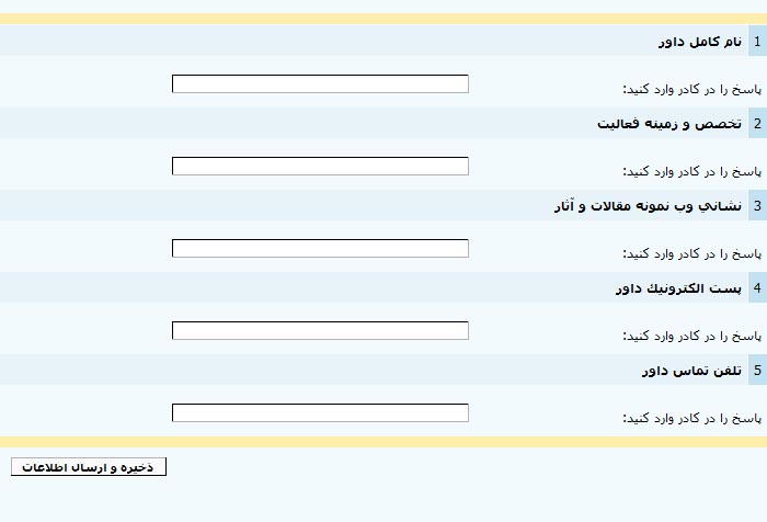 • در سامانه‌ی همایش و دیگر سامانه‌ها، فرم‌های پیش‌فرض در برنامه وجود ندارد. مدیر پایگاه فرم‌های لازم را در بخش ساخت فرم می‌سازد و سپس در بخش تنظیم فرم داوری به برنامه معرفی می‌کند.
